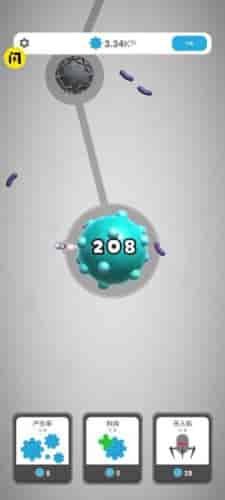 2、为关卡制,病毒的能力会越强、体积变大、移动速度变快。需要不断消灭他们