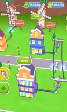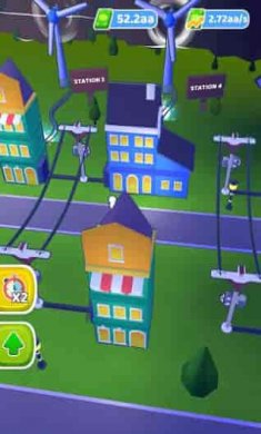 2、多种风力发电机和民宅的造型设置等待玩家解锁。玩家可以通过多种升级机制提升发电效率。